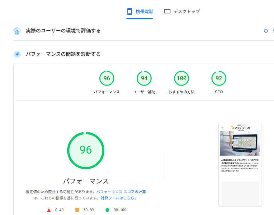 当サイトを測定した際の、携帯電話数値は96ポイントでした。90ポイント以上を目指しましょう。